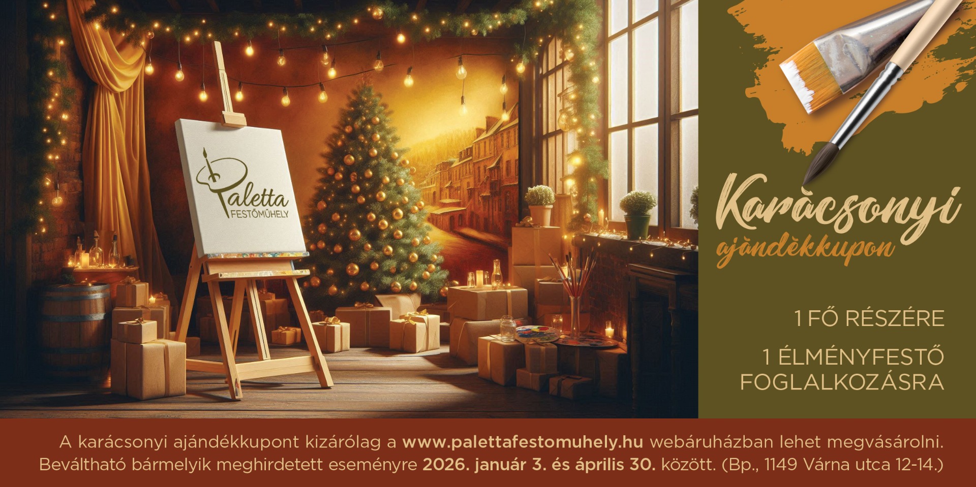 Az ajándékkupon kizárólag a megadott időszakban (jan. 3. és ápr. 30. között) használható fel, akár gyerekeknek, akár felnőtteknek meghirdetett festésre. (Pénzre vissza nem váltható.)
